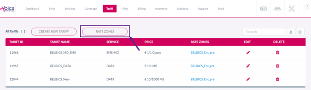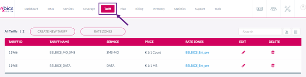 On the top menu, click Tariff to view the Tariff details. Refer to the following screen.