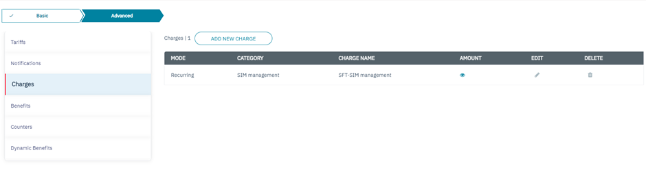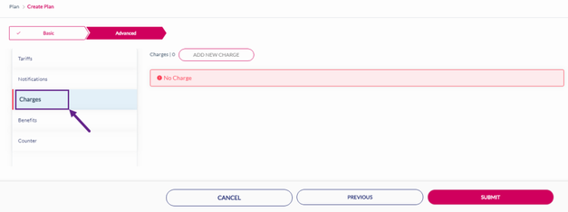1. After adding the Notifications, click Charges to add charges to the rate plan. Refer to the following screen.