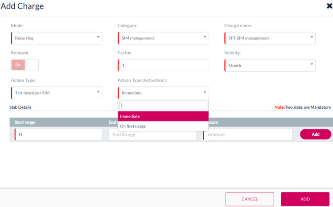 On select of action type as Tier based per SIM action type (activation) field will appear (by default it will be immediate) select the required activation type.