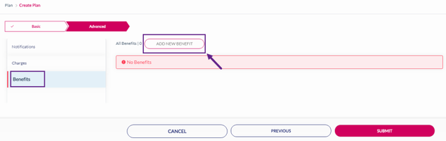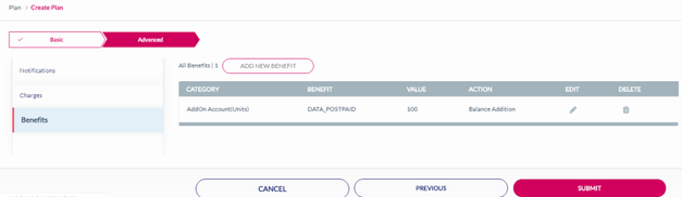 22. After adding the Charges, click Benefits to add a Benefit to the rate plan. Refer to the following screen.
