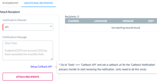 Notification Channel | Select the channel through which the notification needs to be sent. Note: Email and API is applicable only for Additional recipients |