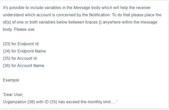 Notification Message | Enter the notification message to be triggered for this Notification type. When click on Notification Message box below explanatory popup will be displayed. |