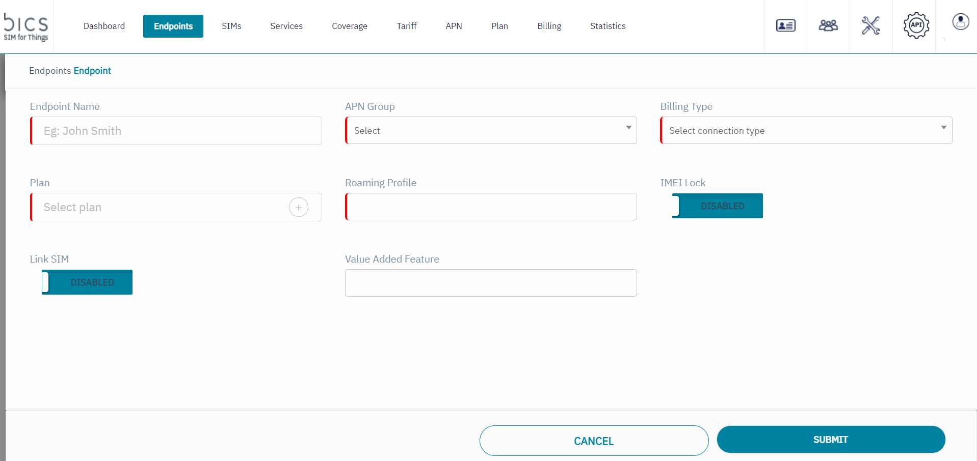 Value added feature | If an enterprise have feature based SIM management fee charge configured in it’s base plan, then Value added feature feild will be visible in the create endpoint screen. ![]() Adding a value added feature can be done with or without linking a SIM to the endpoint and/or activating the endpoint. |