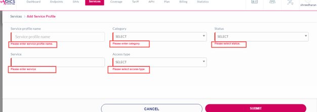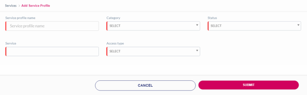 If you click Submit, without entering the Service profile details in the mandatory fields, the following notification is displayed on the Add Service Profile screen.