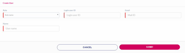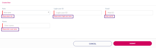 If you click Submit, without entering the user details, the following notification is displayed below the missing fields on the Create User screen.