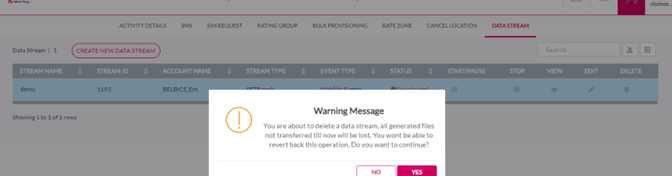 2. After clicking delete button, you receive " You are about to delete a data stream, all generated files not transferred till now will be lost. You wont be able to revert back this operation. Do you want to continue?" message, click Yes to confirm the action or click No to discard the action.