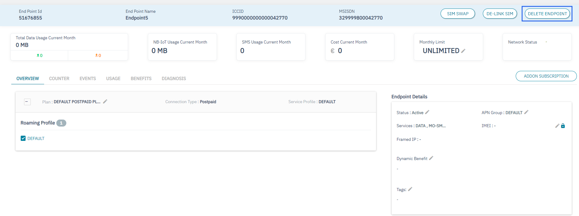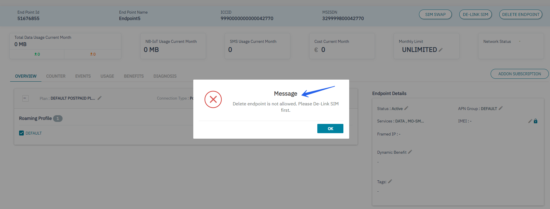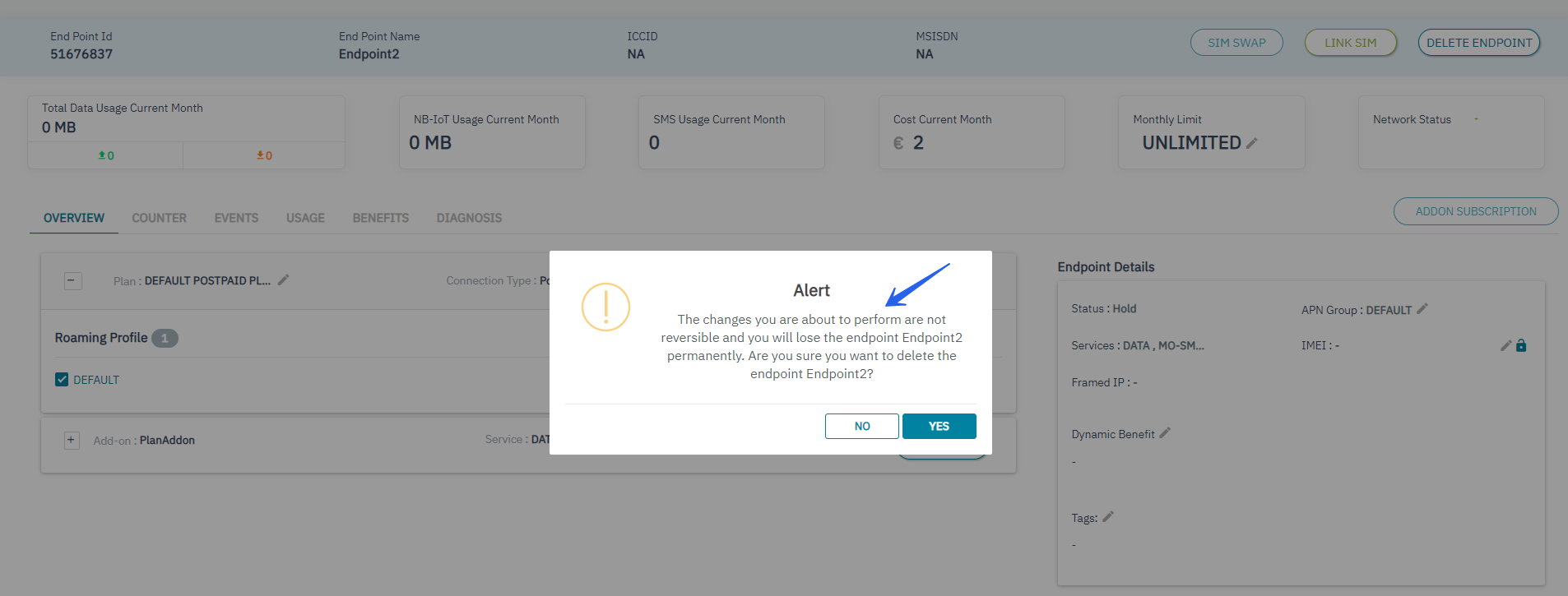 6. Delink sim and click on Delete Endpoint button clear warning message will display indicating that not reversible and you will lose the Endpoint click on