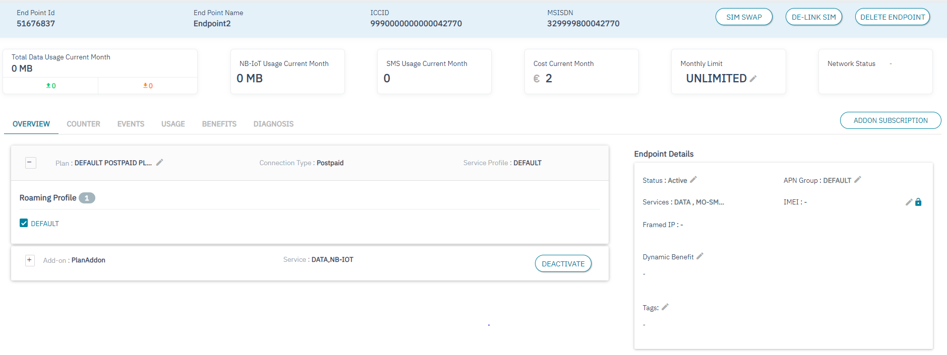 2. Click the Endpoint ID of the endpoint with SIM status as "Active". Refer to the following screen.