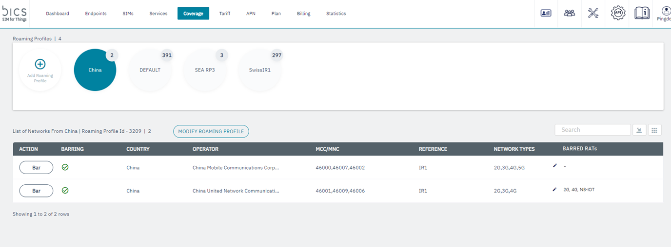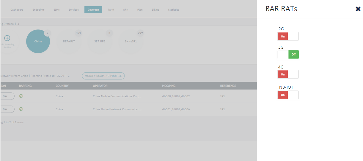The view Network Coverage on the Endpoint CRM / Diagnostics should also show the status of the the barred RATs for the networks of displayed.