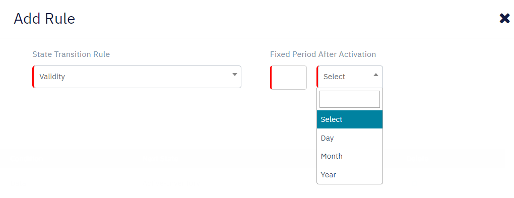 When you select State Transition rule as "Validity", the following fields are displayed