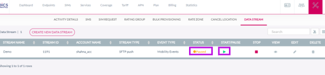 Start/Pause | On click of start button, system will change the stream status to start. System will start generating the files in this state for SFTP data stream and for callback API(Bulk) system will collect and send all events to customer DC. Start button is available to users with the right permissions. On click of pause button, system will change the stream status to pause. In Pause status, stream is producing the files without them been forwarded to the customer. Pause button is available to users with the right permissions. |