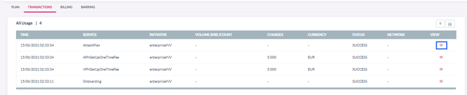 Service | Indicates the type of service available under the current plan for the account. For example Data, MO-SMS, or MT-SMS |