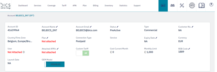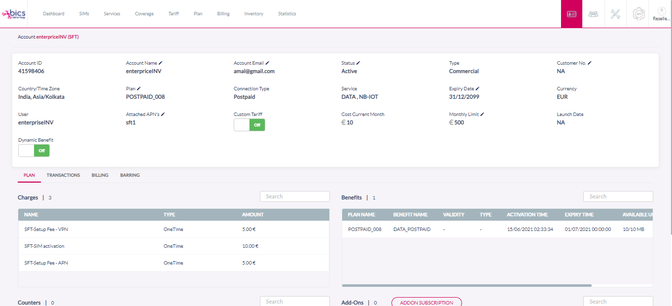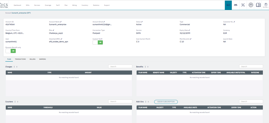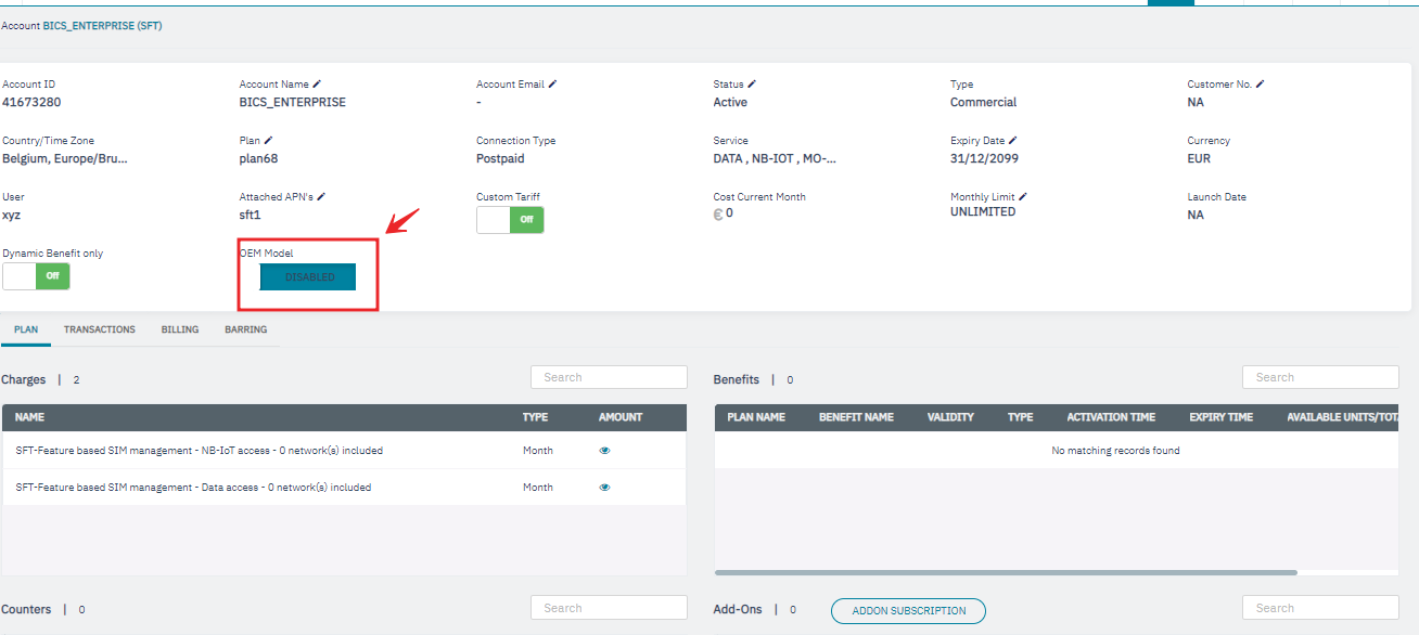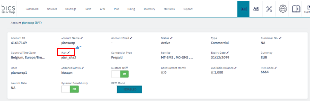 Plan | Indicates the current plan of the account. ![]() to modify the plan. Note: Plan swap is not allowed if the current plan contains Dynamic Benefits. Note: Plan Swap is not possible for the customer if MDB is activated. Note: Plan Swap is not enabled if OEM is enabled. |