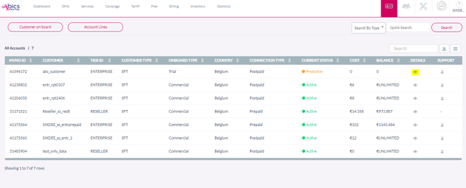 Customer Type | Indicates the type of customer. For example SFT or M2MIC.By default, the Customer Type column is not displayed. You can view the Customer Type column using the show/hide columns ( ![]() ) button. |