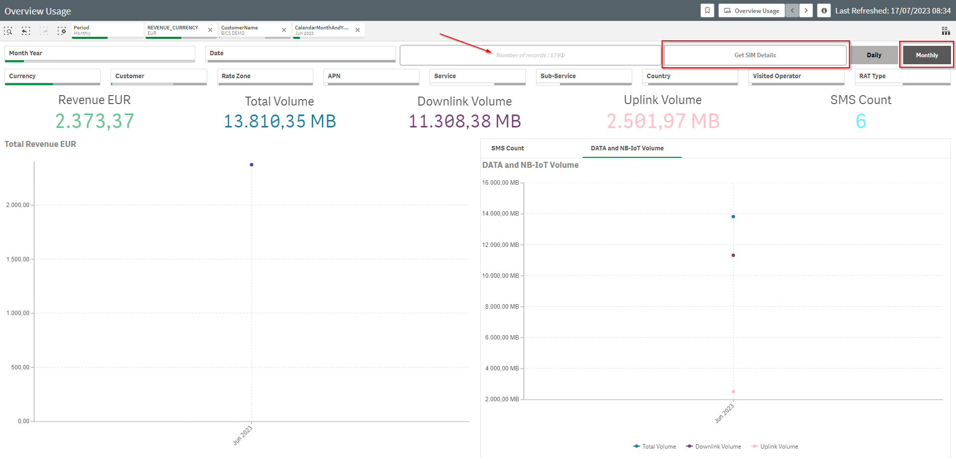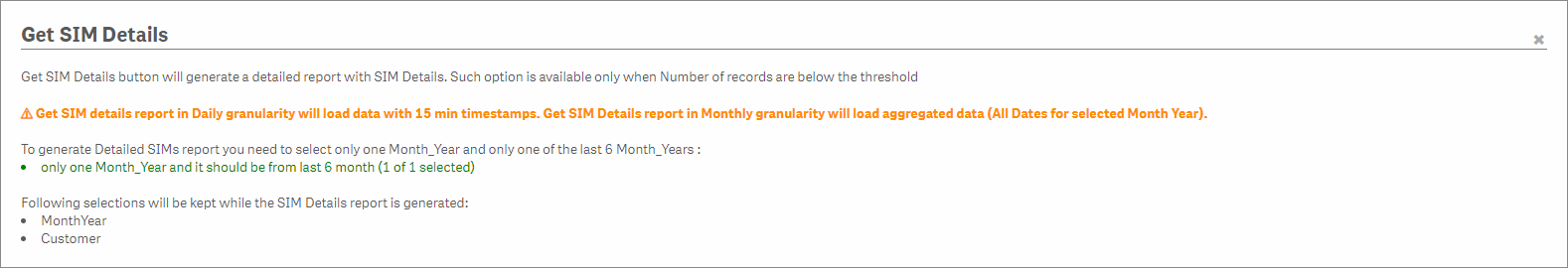 Note that for both options, GET SIM DETAILS availability is limited to 1.500.000 records. In case MONTHLY is selected, the number of (raw) records is significantly reduced.