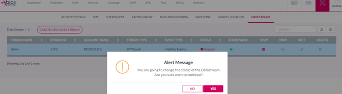 a confirmation message is displayed indicating "You are going to change the status of the data stream. Are you sure want to continue?"