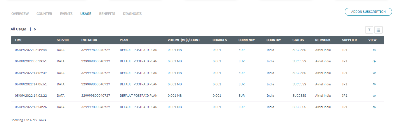 Note: The usage tab lists the transactions under the Enterprise.