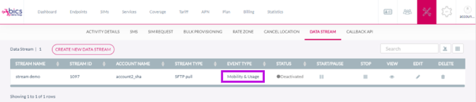 Mobility Events | Shows the mobility events that were selected during the creation of data stream or/and Usage Events. |