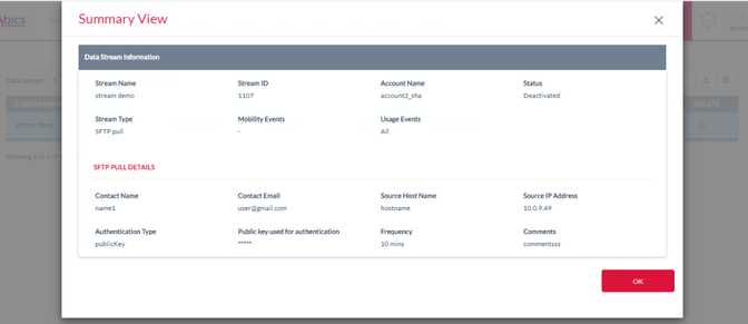 5. Summary View of SFTP Pull with Authentication Type as Public/Private Key Data Stream and selected only Usage Events.