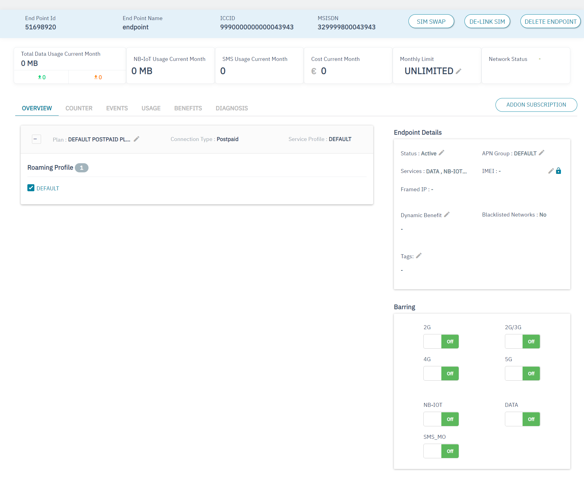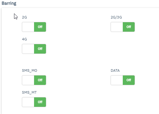 DATA | Push button to bar or unbar the data services. After barring, the endpoint cannot access the internet using any of the networks (2G, 3G, 4G,5G). |
